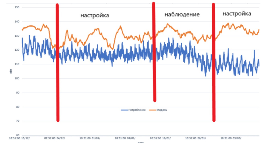 На основании множества накопленных исторических данных выявляется тренд, по которому строится математическая модель прогнозируемого энергопотребления. Затем рассчитанный прогноз сравнивается с текущими фактическими показателями. - действующее оборудование Ридан на объектах;