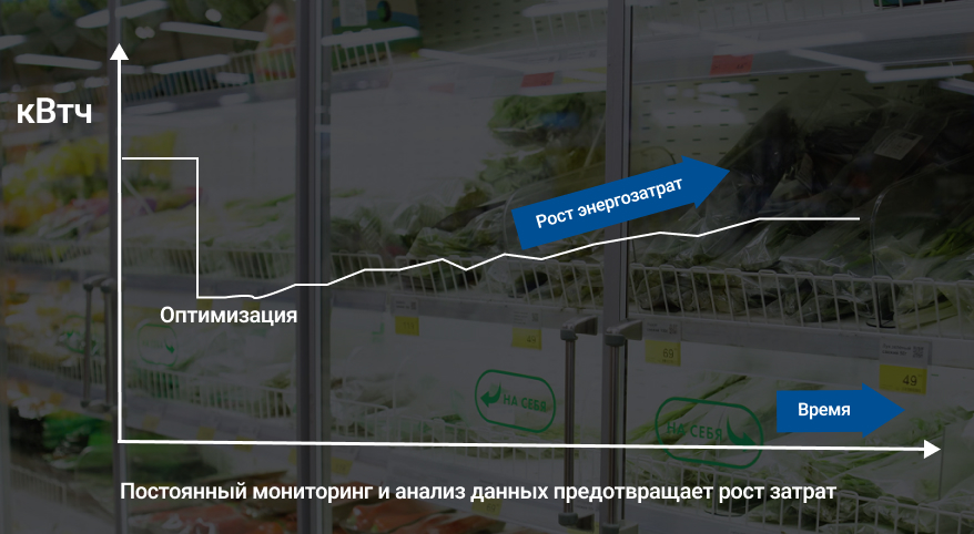 До 40% энергопотребления магазина приходится на холодильное оборудование. В гипермаркетах эта проблема стоит особенно остро: среднее потребление достигает 120 кВт ч, а ежемесячные затраты — около 500 тыс. рублей. И с каждым годом эта сумма растёт: тарифы повышаются, изнашивается техника, ненадлежащее обслуживание.