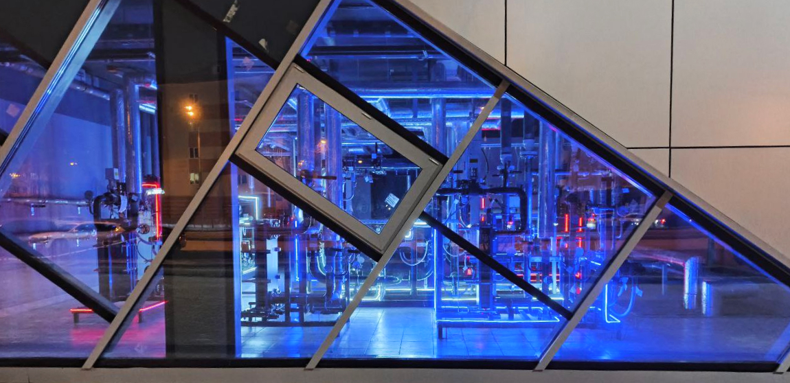 Особенность решения — открытая установка за витражным остеклением, где современное инженерное оборудование становится частью дизайна пространства.
