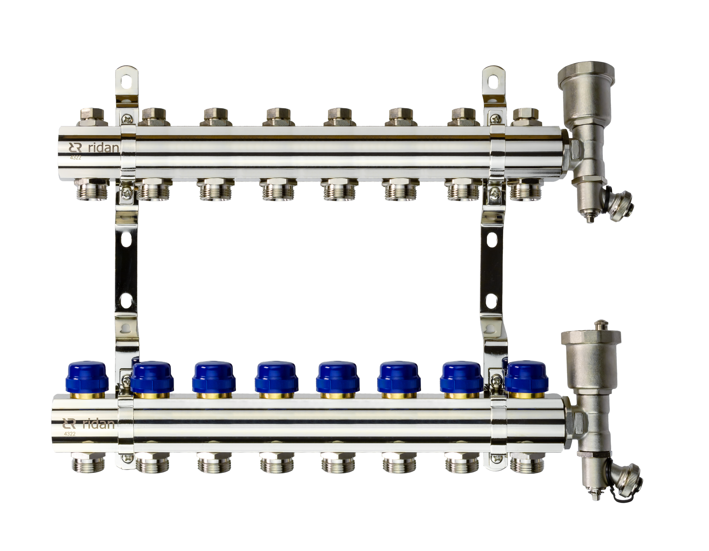 Ридан 088U0709R — Комплект коллекторов FHF-9R set с кронштейнами и торцевыми секциями с автоматическими воздухоотводчиками, 9 контуров | Латунь никелированная | 90 | 16 | 10 | ||||