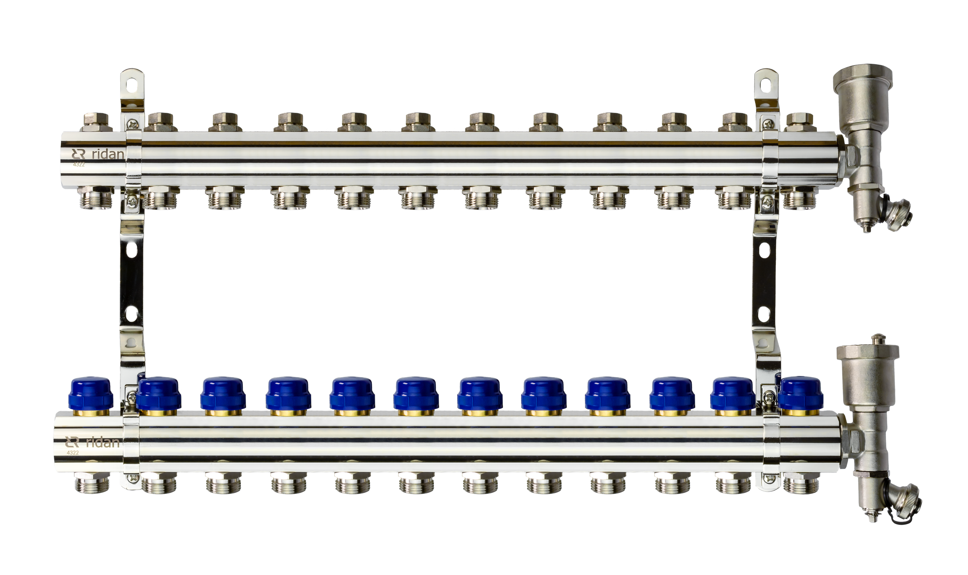 Ридан 088U0712R — Комплект коллекторов FHF-12R set с кронштейнами и торцевыми секциями с автоматическими воздухоотводчиками, 12 контуров