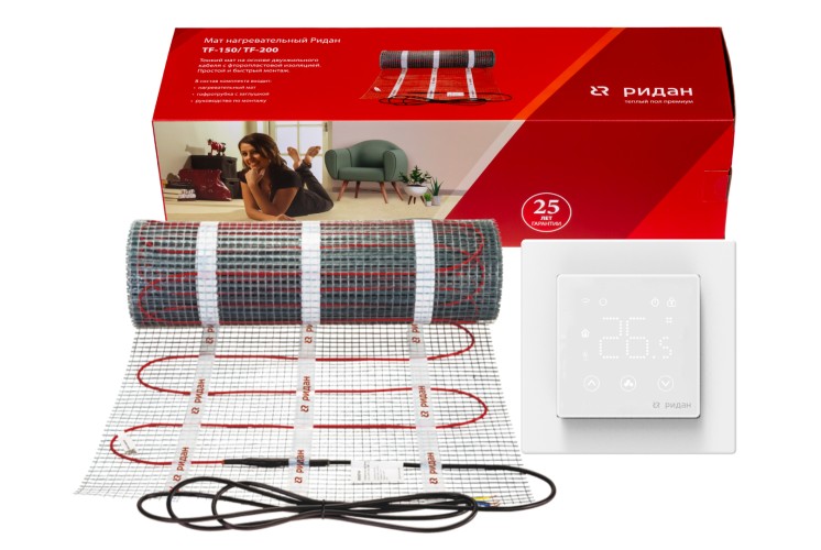 Ridan 21RT1038R — Нагревательный мат Ridan TF-150 5 м² с терморегулятором Ridan Clever (белый) | IP 20 | 150 Вт/м² | 5,0 м² | 750 Вт | 71 Ом | |||